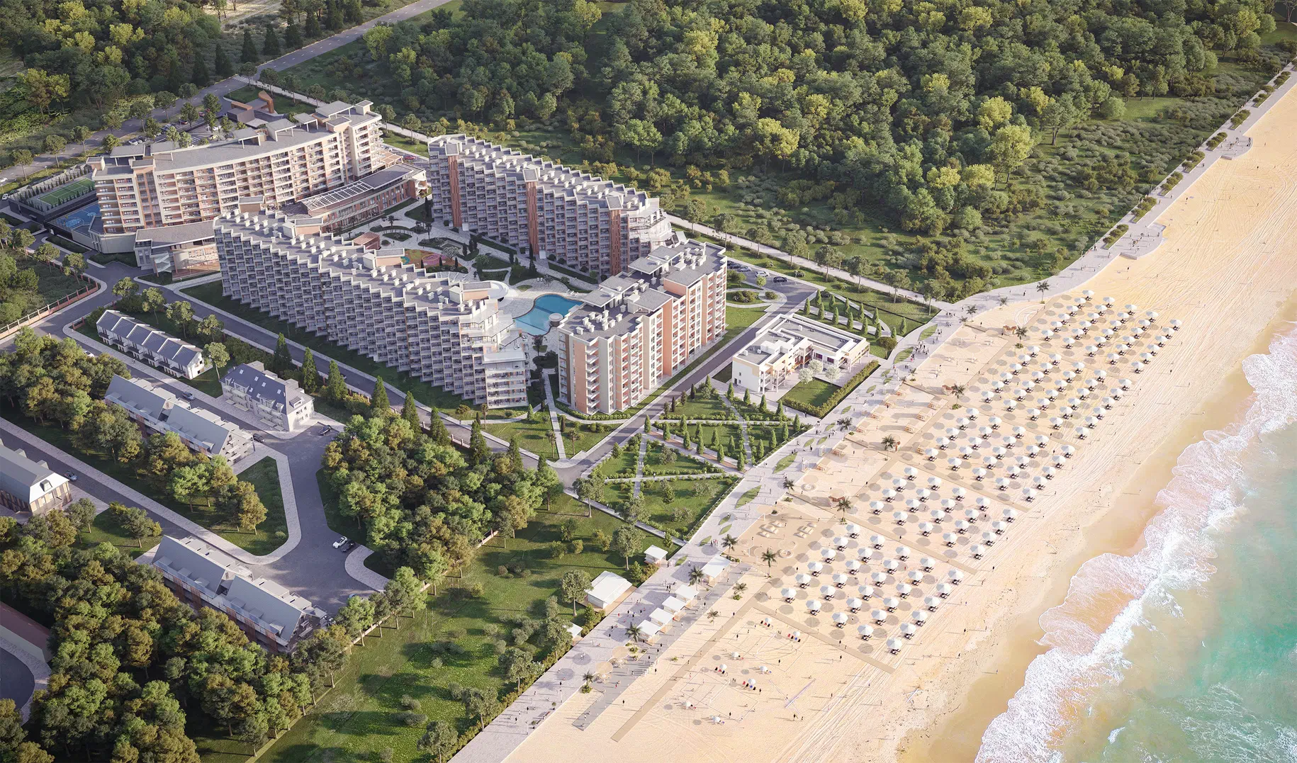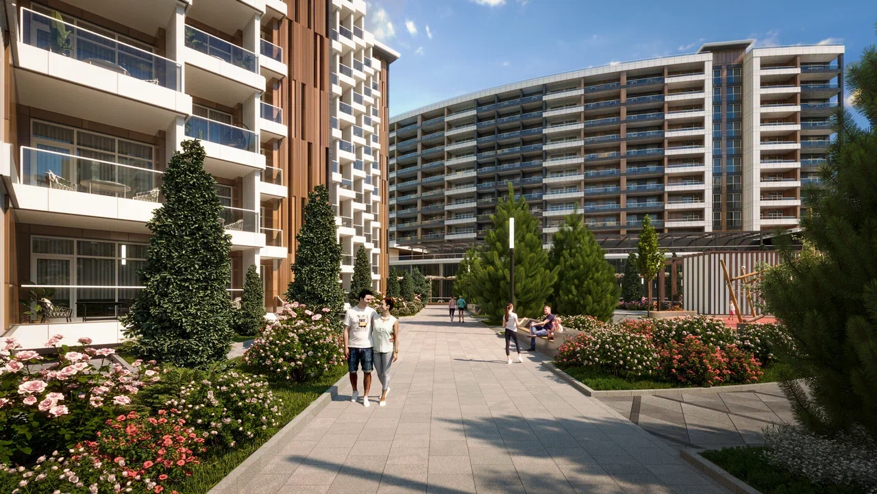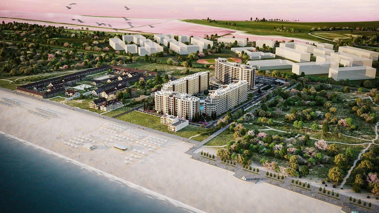 Комплекс включает 8 секций, с этажностью от 9 до 12 этажей и в общей сложности 1213 апартаментов. Уникальное расположение, всего в 100 метрах от пляжа создает отличные условия для комфортной жизни и незабываемого отдыха.